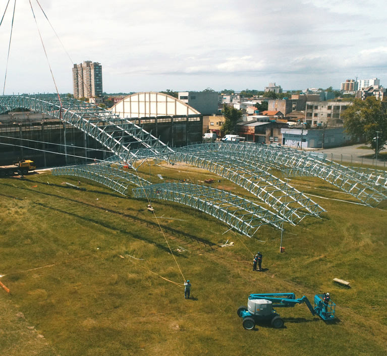Projeto executado após décadas das instalações do ginásio fechadas, com vão livre de 53 metros, sendo toda nova estrutura metálica da cobertura com tratamento de galvanização à fogo, visando maior proteção numa região marítima.